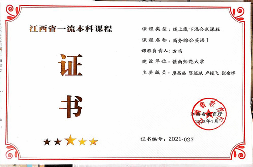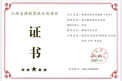 1.课程建设成效显著。课程建设是专业建设的基石,是提高人才培养质量的根本。近年来,学院以提高人才培养质量为目标,不断加强课程与教材建设,积极推进课程教学改革,课程建设成效较为显著。2022年,方鸣教学团队《商务综合英语I》获批江西省一流本科课程;2022年,陈莹教学团队《英汉翻译理论与实践》获批江西省课程思政示范项目。2023年,姚桂招教学团队《英语课程与教学论》获批国家一流课程。2023年还获批立项校级课程思政示范课程8门,校级课程思政教学研究示范中心1个;顺利通过2021年校级课程思政示范项目中期考核及2020年校级课程思政示范课程结项验收工作共10项。